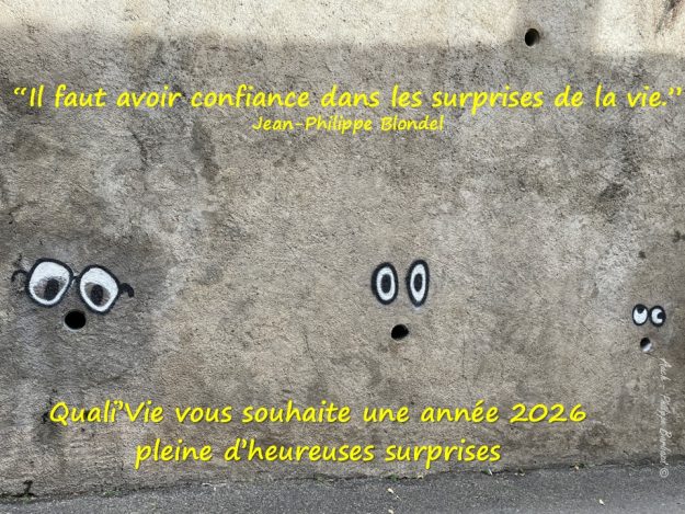 Quali’Vie souhaite à tous une très belle année 2021, avec pour tous moins de contraintes et de mauvaises surprises, mais avec autant de patience, de créativité et d’adaptation, et plus de sérénité et de contacts chaleureux !… Philippe Barbaza