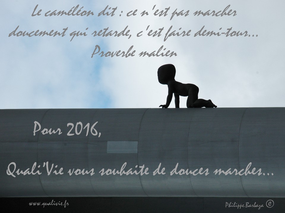 Quali’Vie vous souhaite une très belles année 2016, pleine de sérénité et de douces marches en avant… Philippe Barbaza Catégorie : Voeux1 janvier 2016Étiquettes : Voeux Quali'VieArticles prochesDe beaux rêves accomplis pour 2025 !…1 janvier 2025De nouvelles couleurs pour 2024 !…1 janvier 2024Beauté au détour des chemins de 2023 !…2 janvier 2023Partages et abondance pour 2022 !…3 janvier 2022De nouvelles routes pour 2021…1 janvier 2021Ouvertures pour 2020…1 janvier 2020